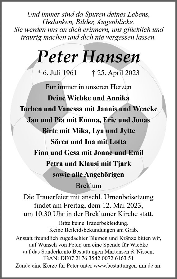 Wir sind sehr traurig über den plötzlichen Tod von Peter.